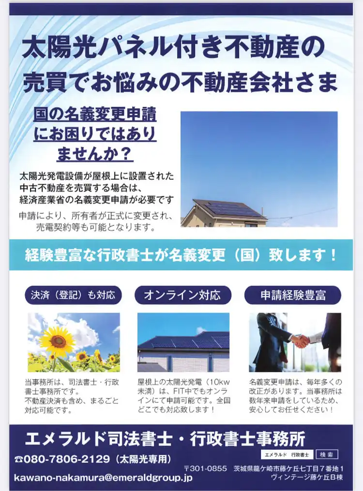 現在、太陽光発電設備の名義変更(JPEA)につき、不動産会社様よりご依頼を多数いただいており、誠に感謝しております。